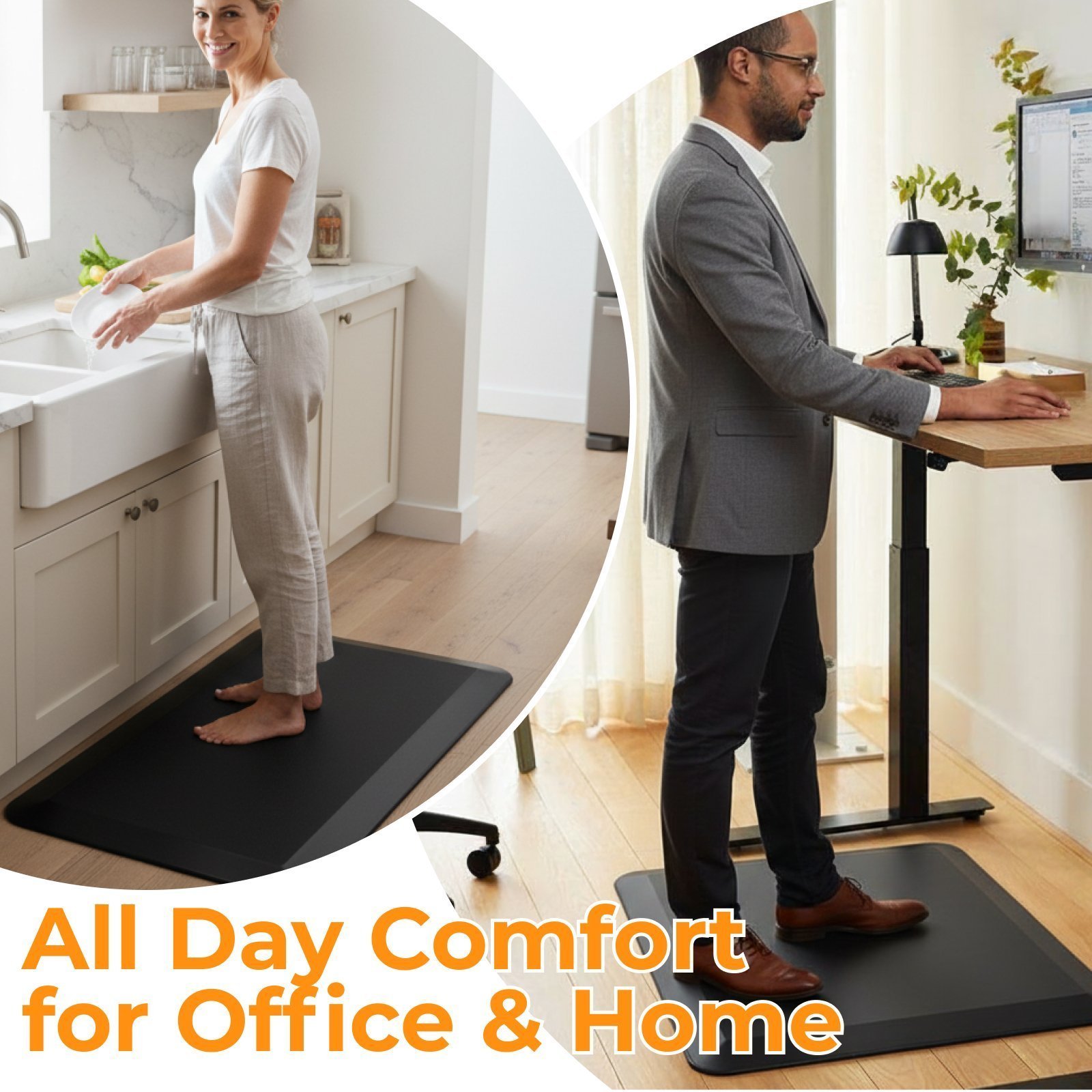 Our anti-fatigue mat is designed to promote blood circulation, reduce pain and uncomfortable caused by long time standing. This standing mat could reduce overall fatigue up to 50%. Anti-slip backing could grip floor well, and keeps mat securely in place. Beveled edge ensures mat will not curl-up and reduces risk of tripping. Waterproof material can be easily clean with some water and a cloth when dirty. It ships flat preventing unwanted creases and curled edges, so your mat is ready for professional use right out of the box.