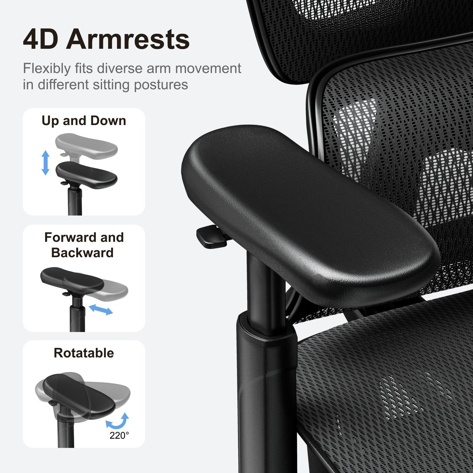 - 3D armrest includes 3 dimension adjustments: height adjustment, forward/backward positioning, and rotation around the axis.