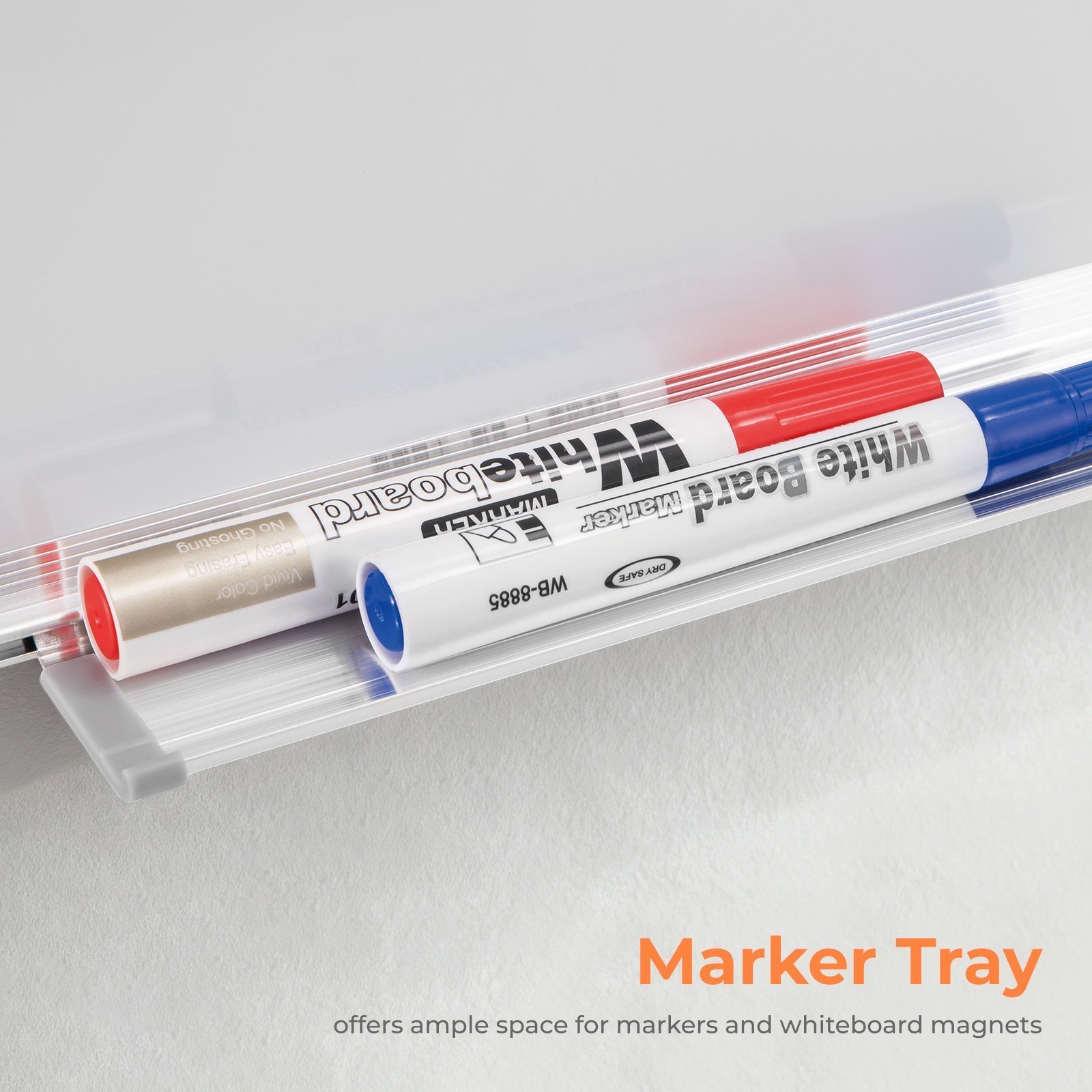 Lightweight, durable and easy to mount, the WB02-1 is an essential tool for organizing ideas and creating visual demonstrations in offices, classrooms and more. The smooth writing surface resists stains and ghosting while the magnetic quality allows printed documents and notes to be easily displayed. The marker tray provides easy storage of whiteboard supplies.