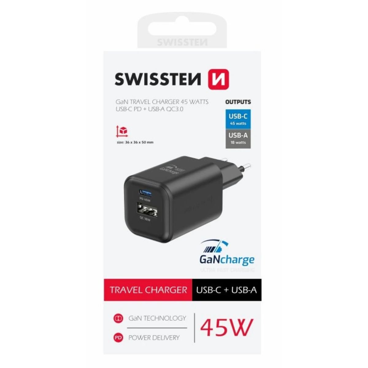 SWISSTEN GaN Φορτιστής 45W με USB-C Power Delivery & USB-A Quick Charge 22071310 Μαύρο