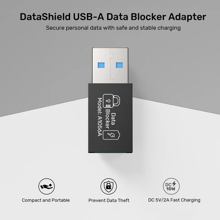 UNITEK DataShield USB-A Data Blocker Adapter blocks data transfer in public charging, preventing leaks and theft. Supports 10W fast charging, compact and portable, compatible with all USB-A devices like laptops and iPhones.