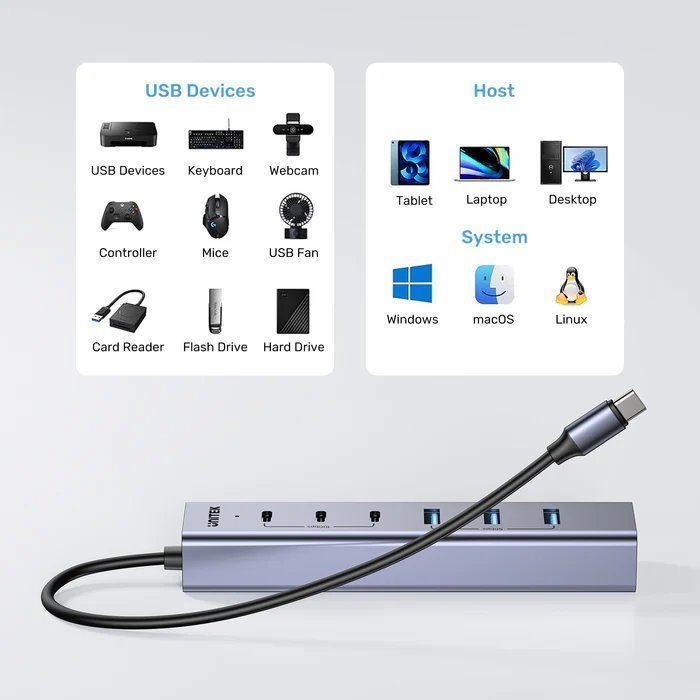UNITEK uHUB S7+ 7-in-1 USB-C Hub offers reliable speed with 3 USB-C 10Gbps and 4 USB-A 5Gbps ports. Featuring an anodized aluminum casing, it ensures stable performance for industrial, office, and lab use.