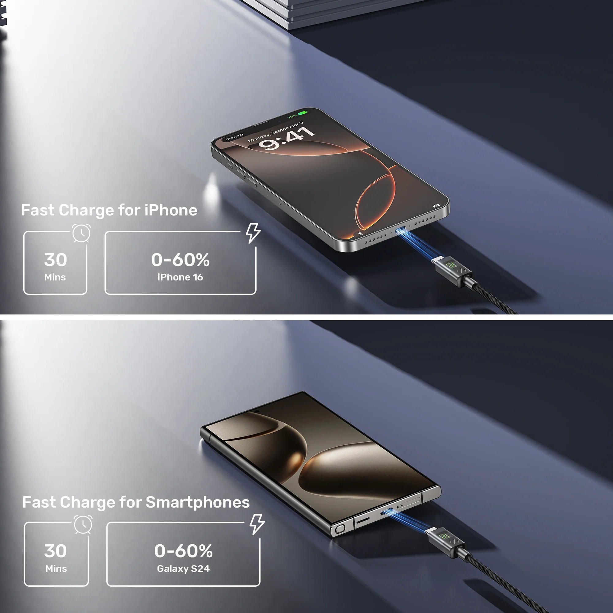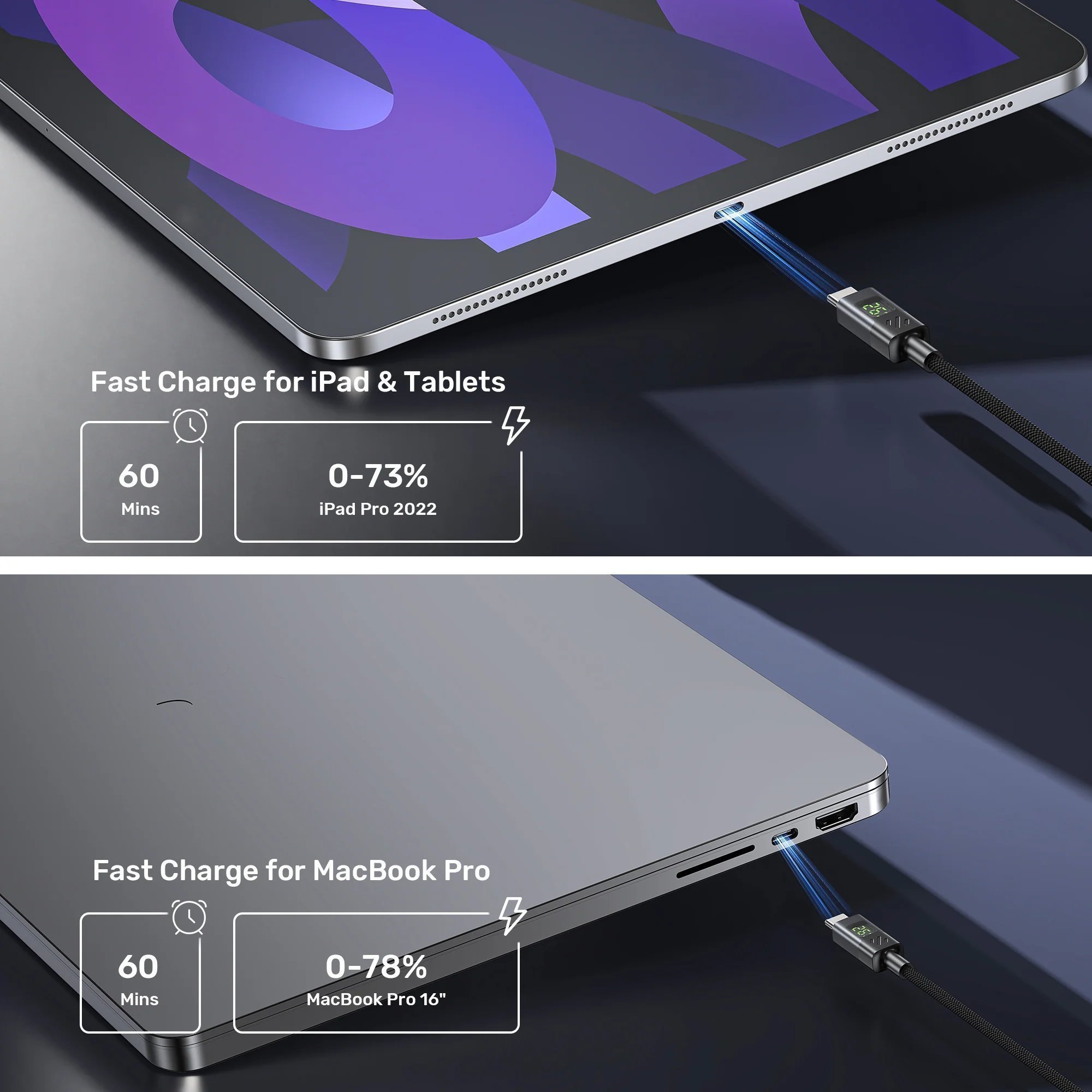 UNITEK PD 60W USB-C Cable with LED display monitors charging wattage. Delivers 60W fast charging and 480Mbps data transfer. Durable nylon braided design, compatible with iPhones, MacBooks, and more.