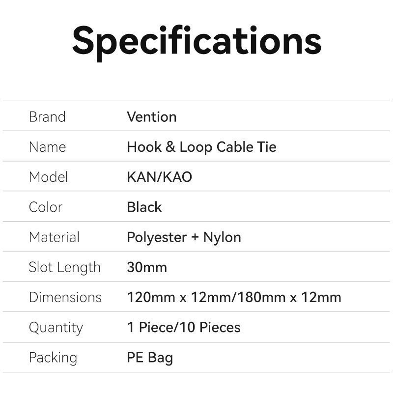 Vention Cable Organiser Hook & Loop Cable Tie 120mm 10 Pcs KANB0-10