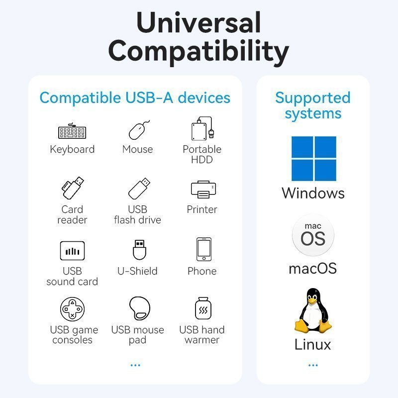 - Universal Compatibility: This USB hub is designed to work effortlessly with a wide range of operating systems, including Windows, macOS, and Linux. You can connect various devices without any hassle, such as: