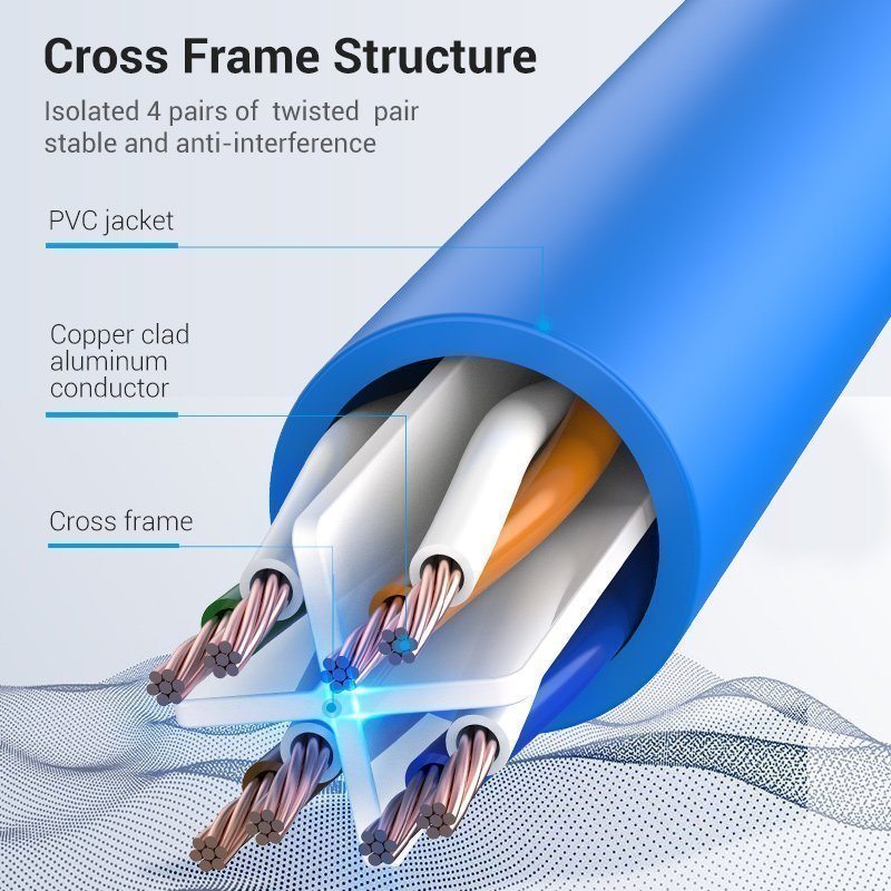 - Enhanced Network Stability: The sophisticated cross-frame twisted pair structure isolates four pairs of double twisted conductors, significantly reducing electromagnetic interference. This design ensures a safer and more stable network connection, making it ideal for environments where a reliable internet connection is crucial. Additionally, the cable is equipped with gold-plated brass contacts, which enhance transmission speed and ensure a highly reliable connection.
