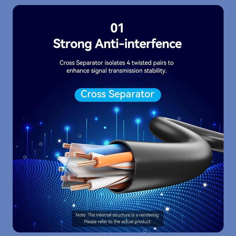 - Cable Type: Cat.6 UTP (Unshielded Twisted Pair). It uses an internal "cross skeleton" (spline) to separate the four pairs of wires, which significantly reduces internal crosstalk and interference