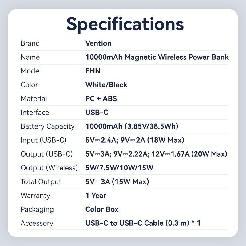 Vention Powerbank Wireless Magnetic 10000mAh 20W Black FHNB0