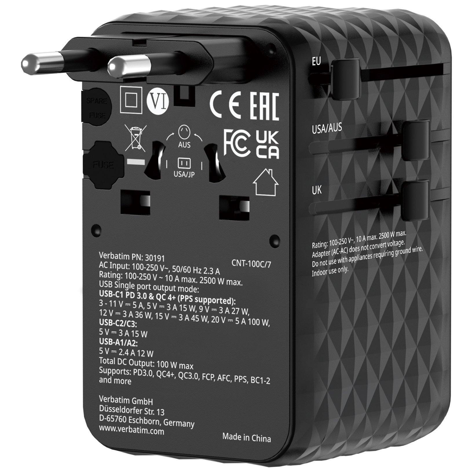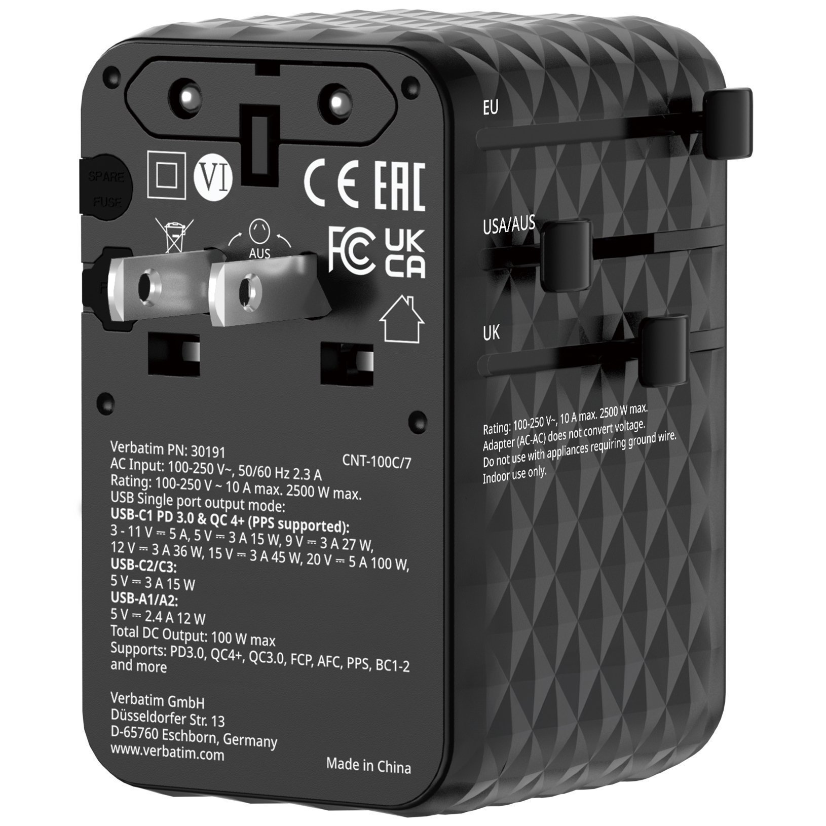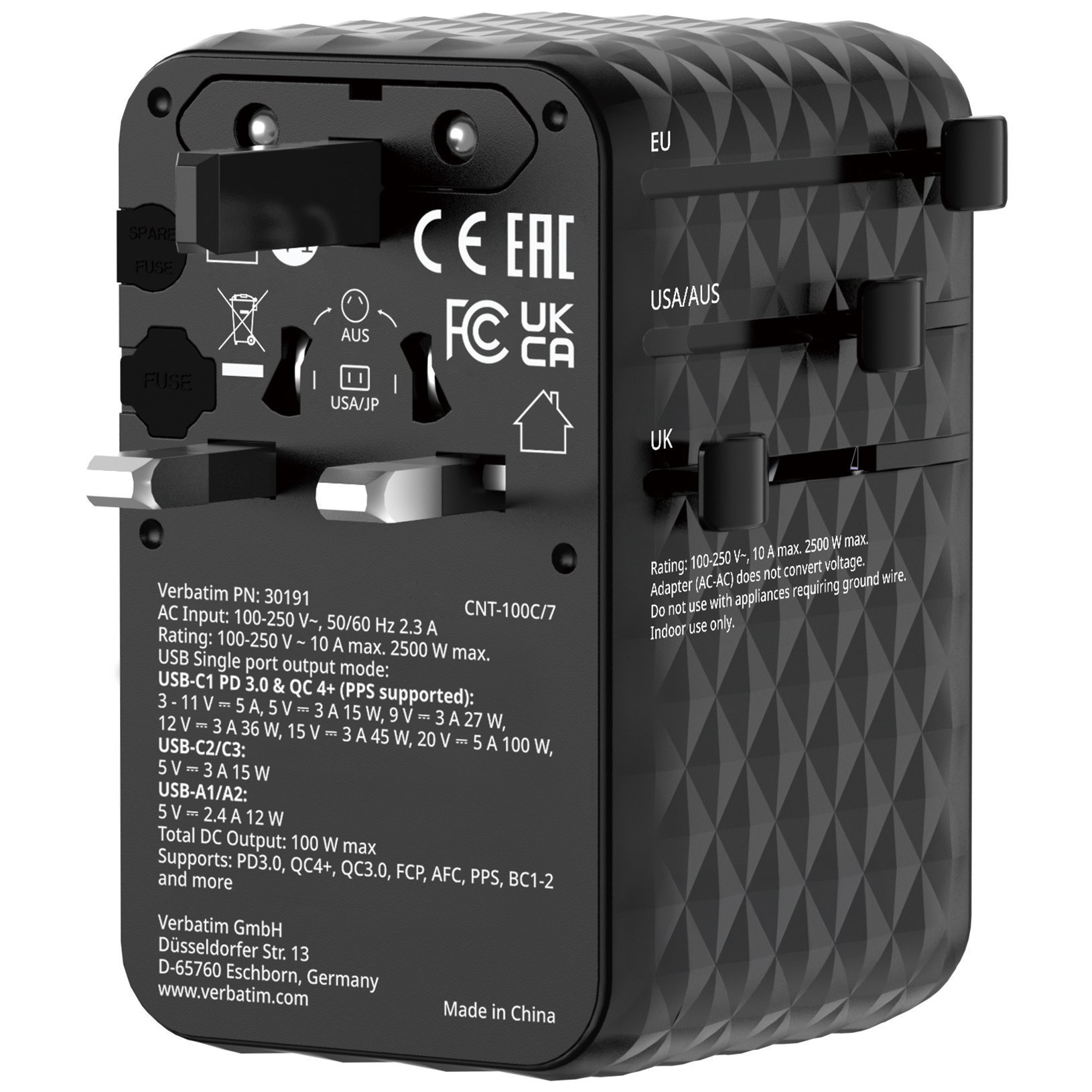 Verbatim Charger Travel Adapter 100W 2xC 2xA 1xRetractable USB-C Black