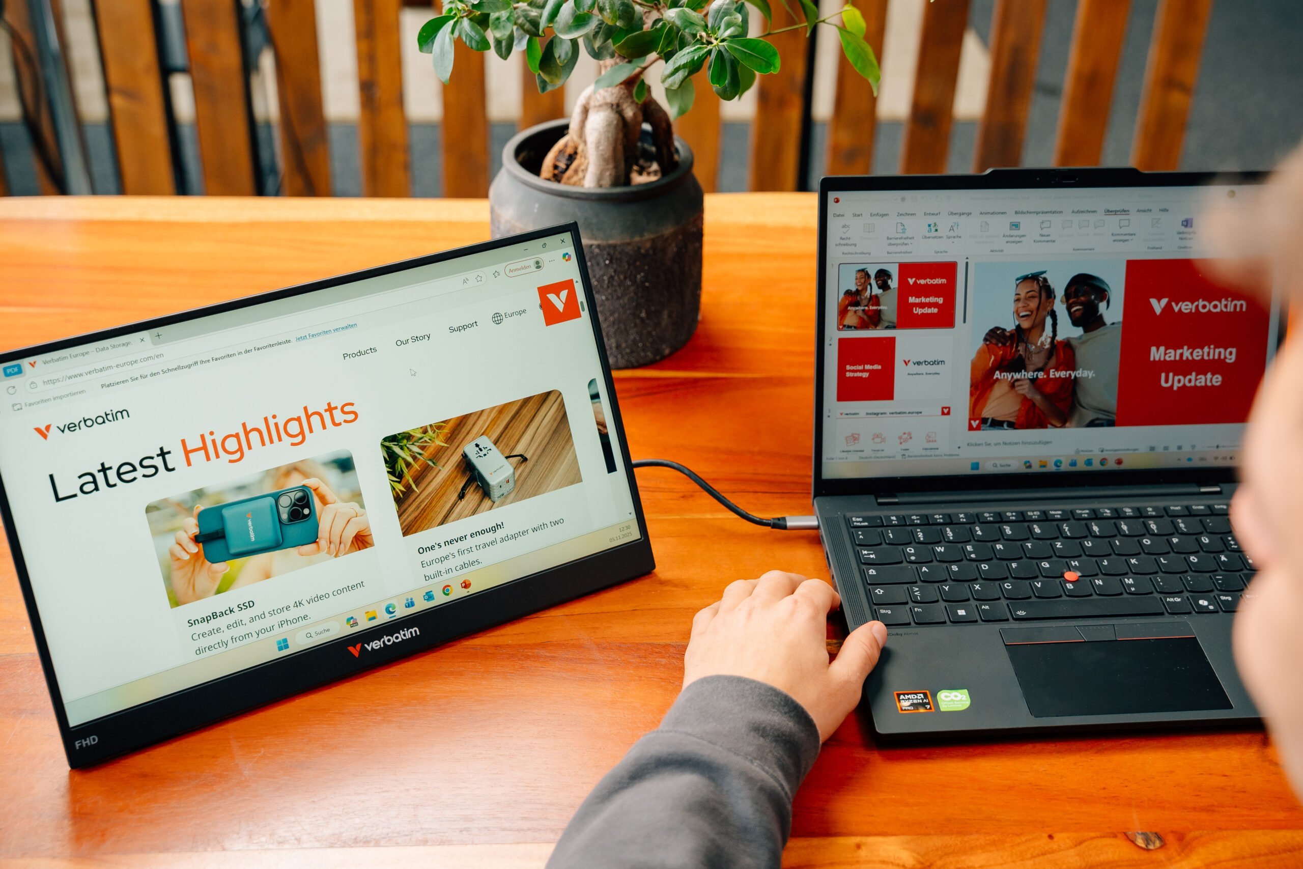 Experience effortless control with the Verbatim LIGHT Series 14” Touchscreen Portable Monitor. With full 10-point capacitive multi-touch functionality, this compact display lets you swipe, tap, zoom, and draw directly on the screen, making it ideal for designers, professionals, and students alike. The plug & play USB-C connection streamlines your setup – one cable handles power, video, and touch input with ease.