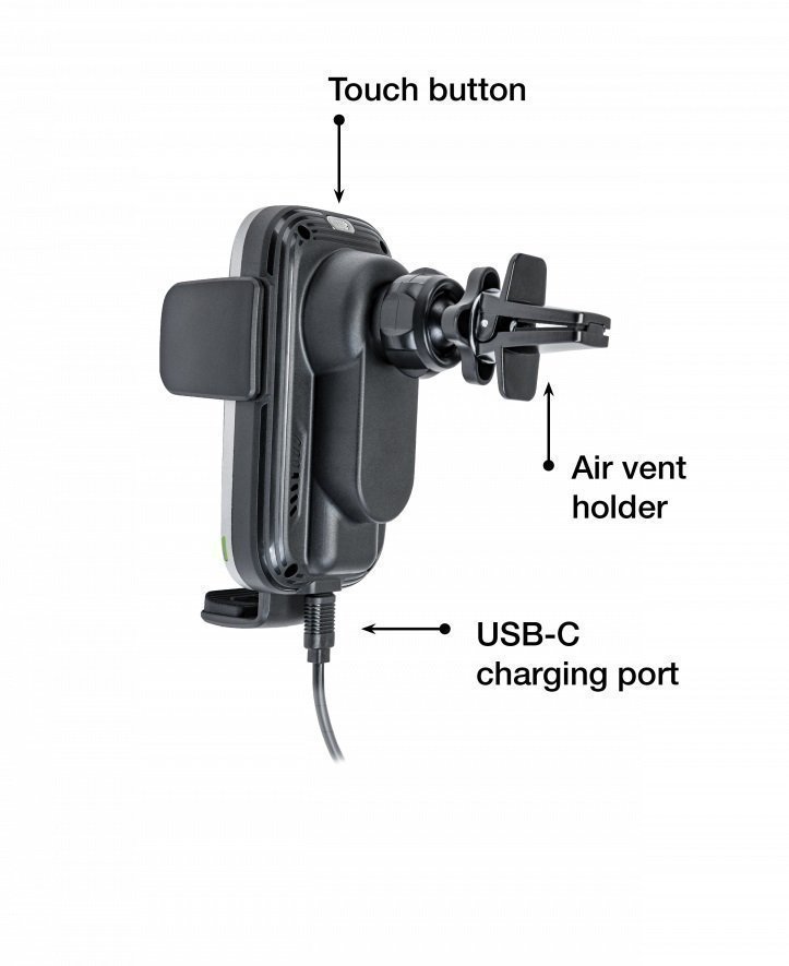 The fast-charging phone holder is easy to use, secure, and convenient. Choose between installing the holder into your car's air vent or fitting it to the dashboard or window via the suction pad. When the phone is placed in the holder, the side clamping arms automatically close, holding the phone securely in place. The arms open with a light touch on the sensor on the top of the charger. The holder can rotate through 360° allowing for optimum viewing and easier use of functions.